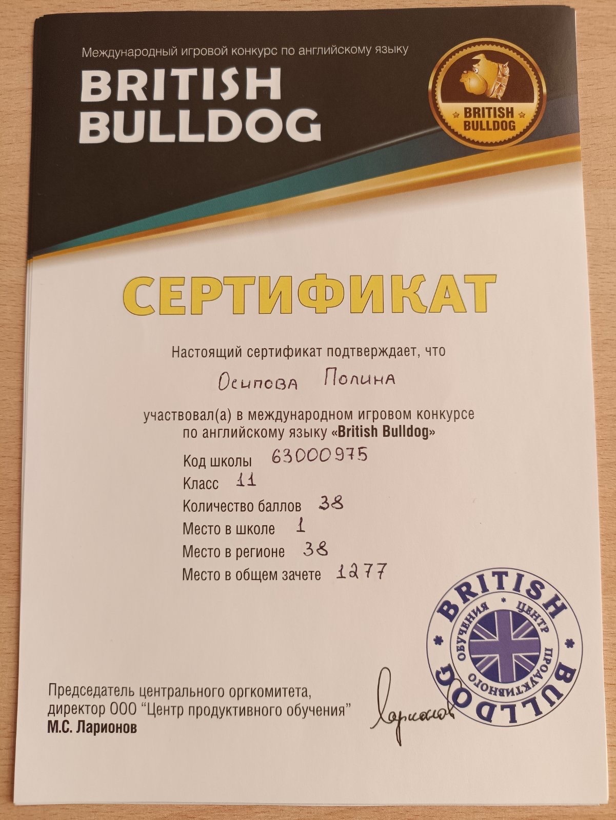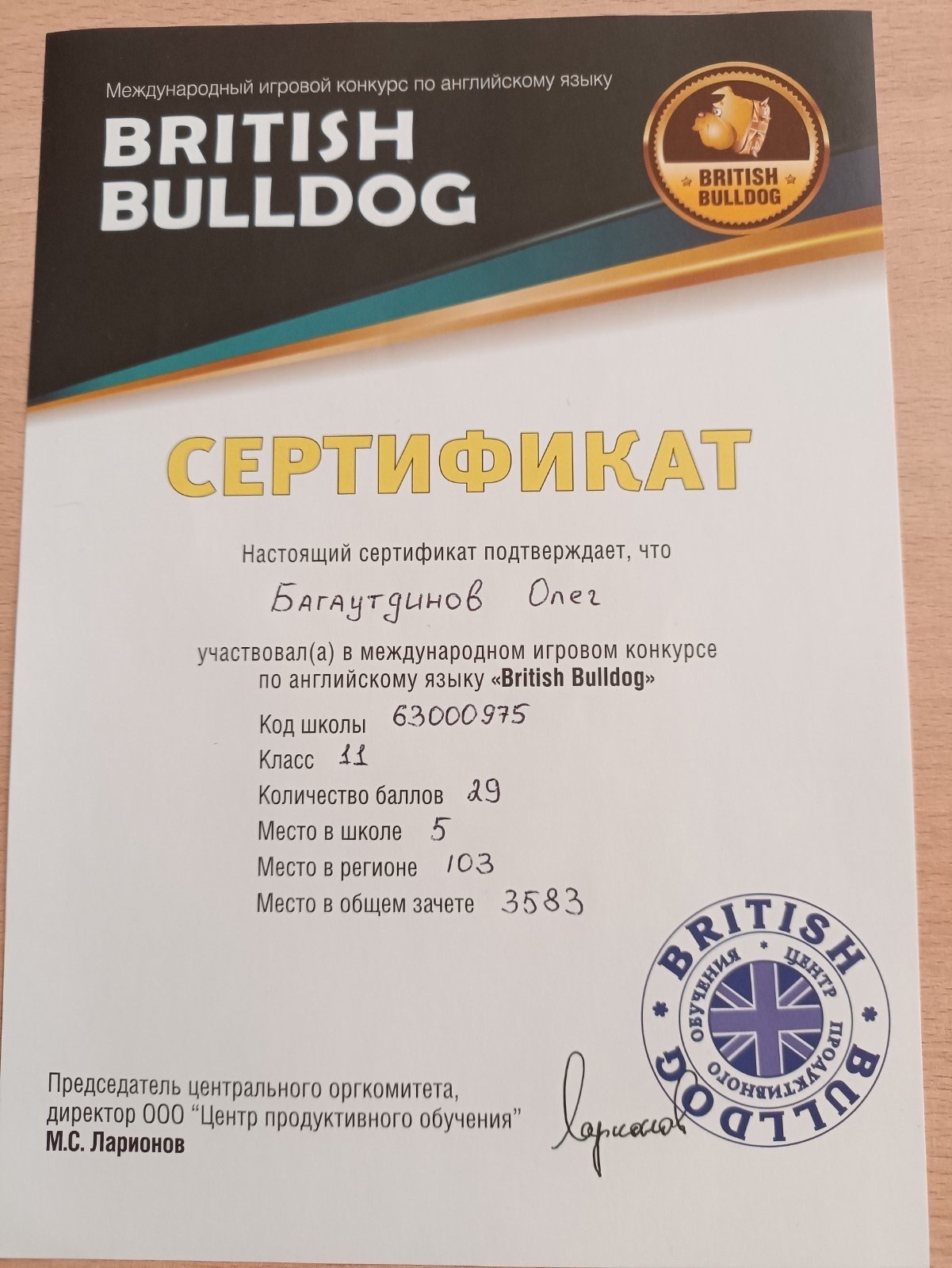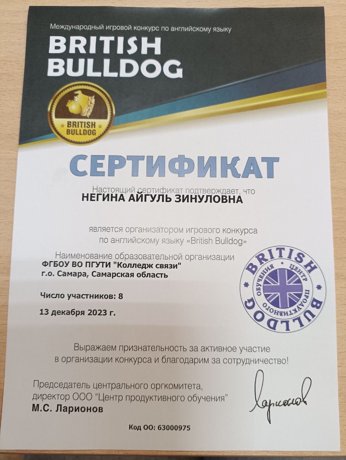 Студенты колледжа Паршина Софья ( гр.1ИСПв-7), Склярова Ирина(гр.1 ИСПв-7), Осипова Полина(гр.2 ИСПв-4), Валитова Самира( гр. 2 ИБ-3), Багаутдинов Олег(гр.2 ИСПп-16), Игуменов Вадим( гр.2 ИСПв-5к), Лыска Вадим(гр. 2 ИСПв-5к), Стегалин Роман ( гр.2 ИСПв-5к) под руководством преподавателя Негиной А.З.приняли участие в Международном конкурсе по английскому языку British Bulldog. Все ребята получили от Центра продуктивного обучения сертификаты об участии и небольшие сувениры. Благодарим ребят за участие в конкурсе и желаем в успехов в изучении английского языка!