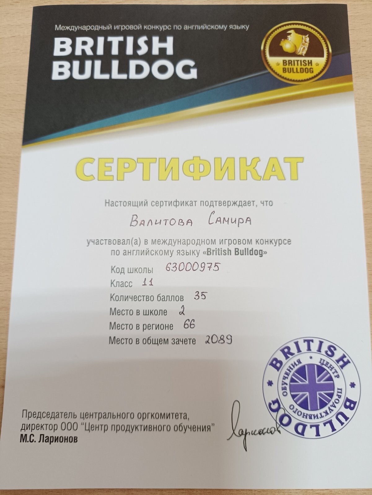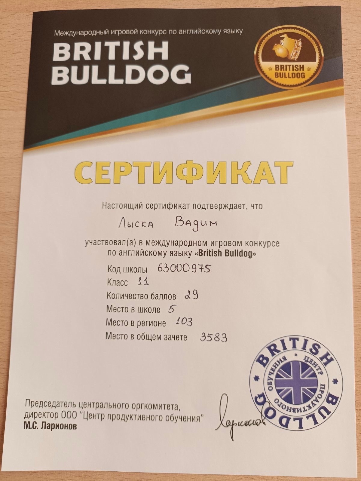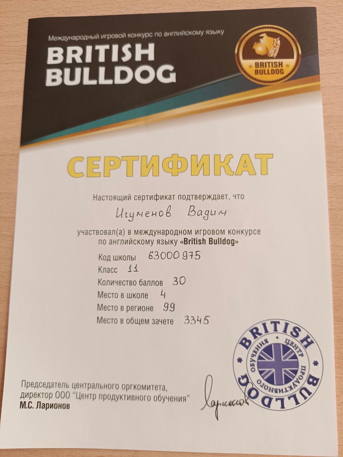 Студенты колледжа Паршина Софья ( гр.1ИСПв-7), Склярова Ирина(гр.1 ИСПв-7), Осипова Полина(гр.2 ИСПв-4), Валитова Самира( гр. 2 ИБ-3), Багаутдинов Олег(гр.2 ИСПп-16), Игуменов Вадим( гр.2 ИСПв-5к), Лыска Вадим(гр. 2 ИСПв-5к), Стегалин Роман ( гр.2 ИСПв-5к) под руководством преподавателя Негиной А.З.приняли участие в Международном конкурсе по английскому языку British Bulldog. Все ребята получили от Центра продуктивного обучения сертификаты об участии и небольшие сувениры. Благодарим ребят за участие в конкурсе и желаем в успехов в изучении английского языка!