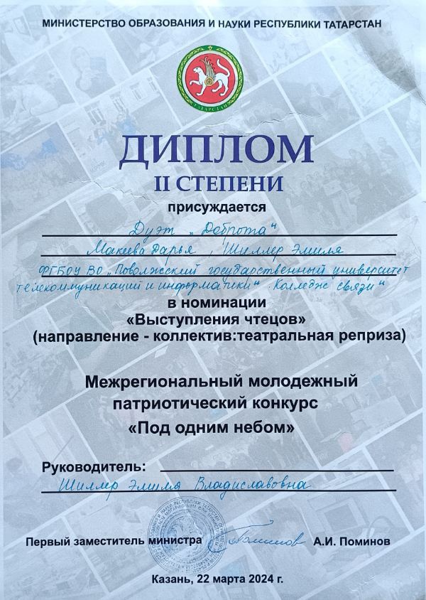 дуэт «Доброта» - Шиллер Эмиля Владиславовна, Макеева Дарья заняли 2 место, а Ивлев Игнат получил сертификат очного тура конкурса в номинации "Выступления чтецов". Наши студенты получили грамоту и сертификаты, подписанные Первым заместителем Министра образования Республики Татарстан!