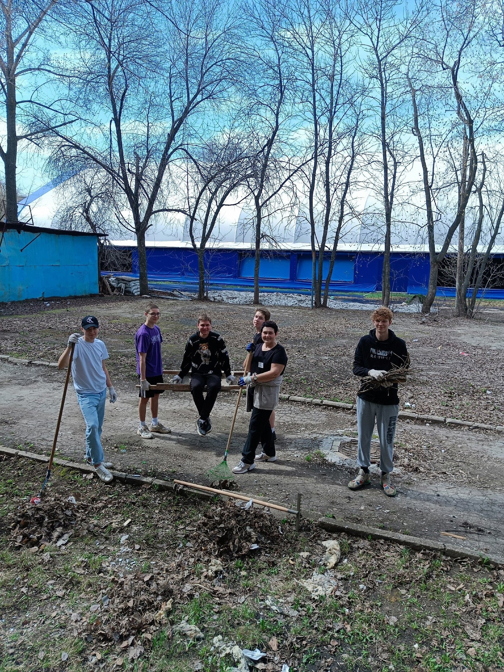Студенты общежития и заведующая М.И.Смагина на уборке территории.