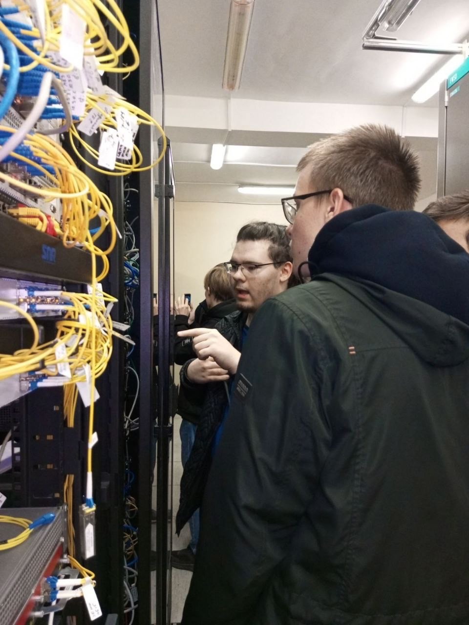 Затем студенты посетили дата-центр. В аппаратном зале ознакомились с кроссовым, серверным и коммутационным оборудованием, со схемой подачи электроэнергии, с организацией системы охлаждения активного оборудования и системы заземления.