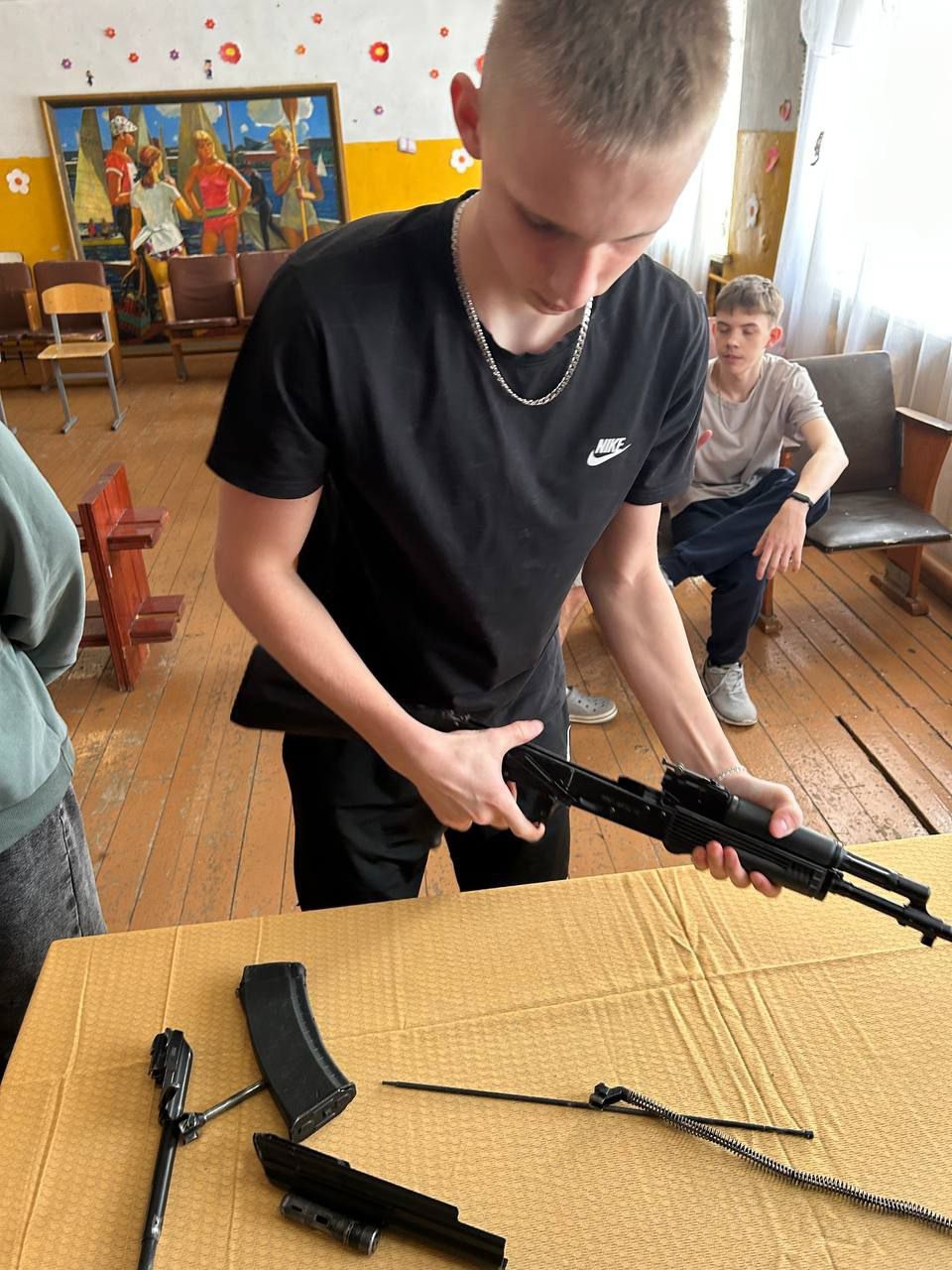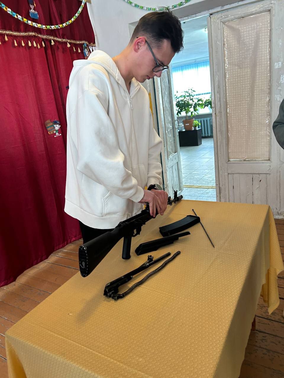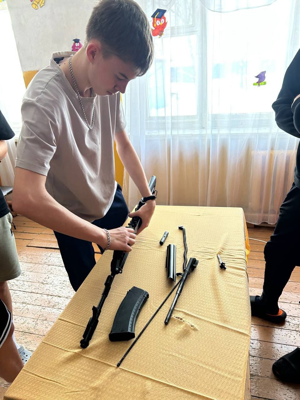 Лариса Владимировна провела беседу со студентами о Законодательстве РФ в сфере службы в РА. Затем студенты отрабатывали навыки разборки и сборки автомата Калашникова.