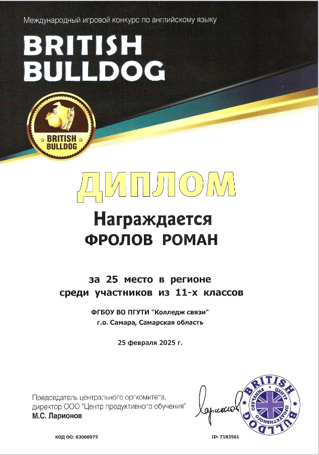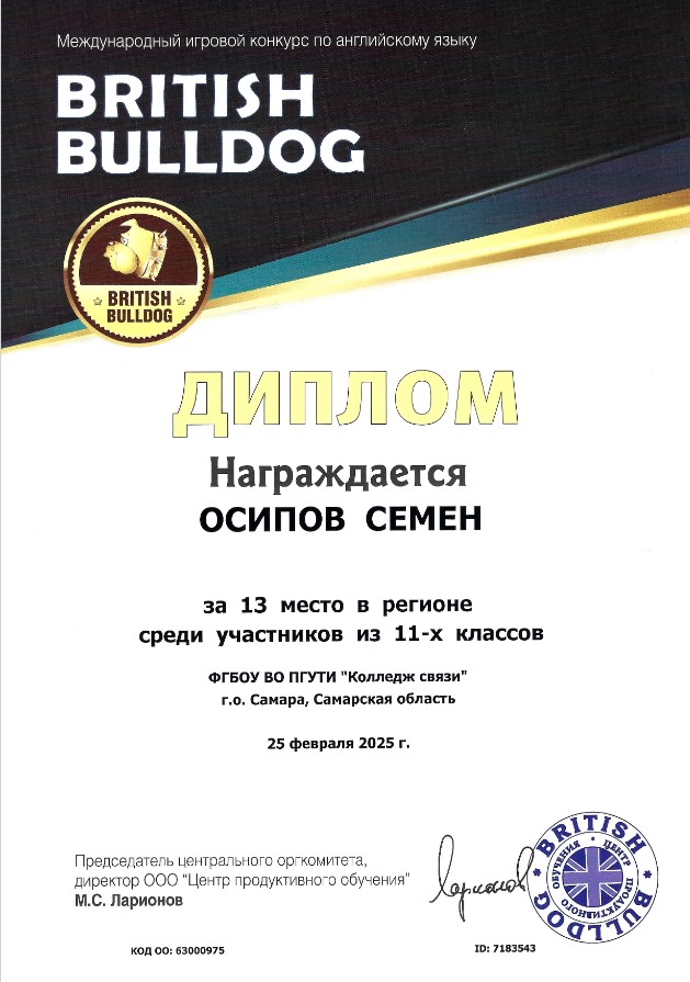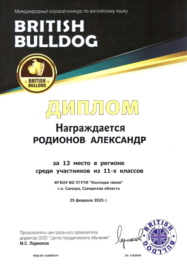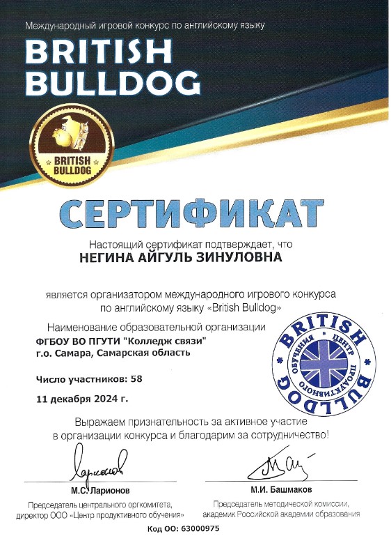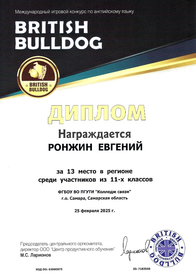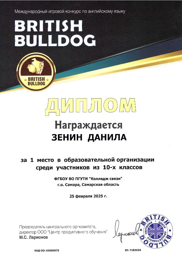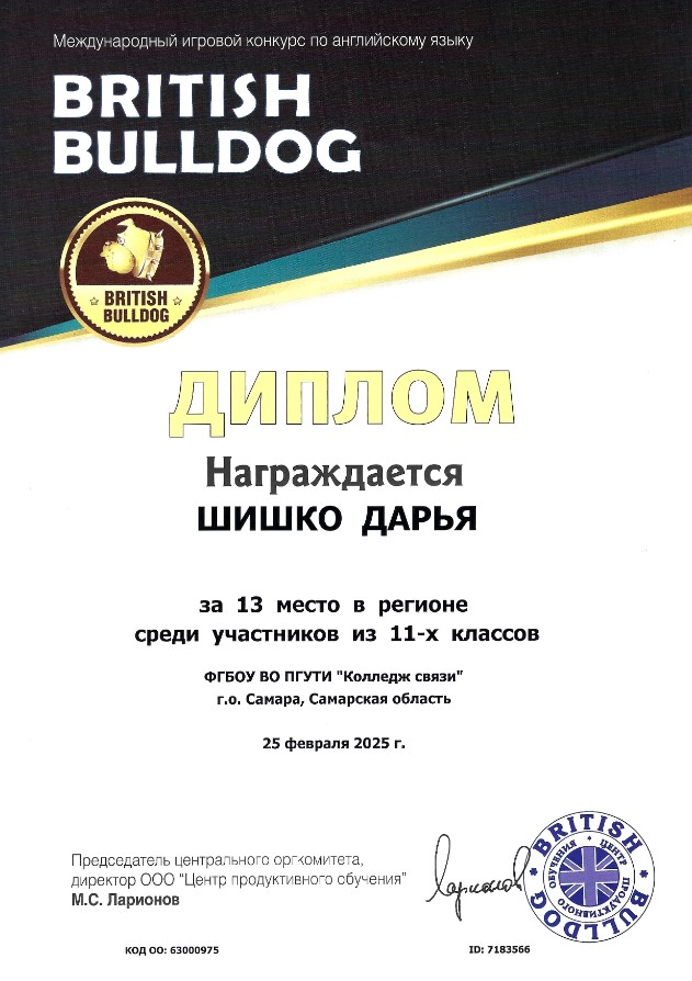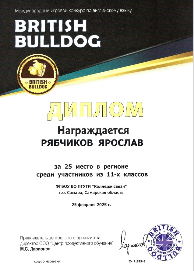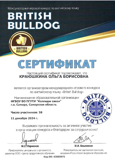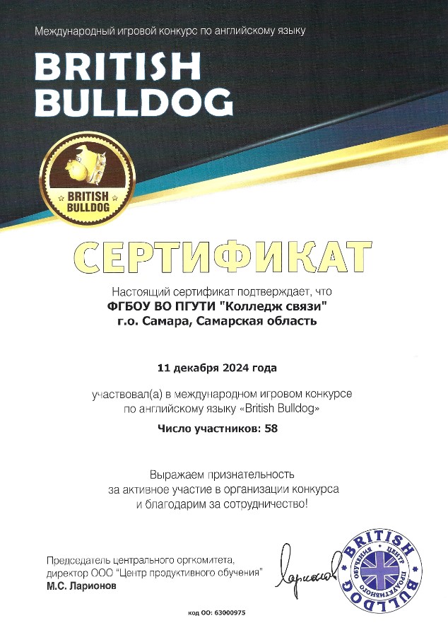 Студенты 1 курса группы 1ИБ-9, 1ИБ-10, 1ИСП-7, 1ИСПП-28 и студенты 2 курса группы 2ИБ-5, 2ИБ-6, 2ИБ-7, 6ИСПВ-6, 2ИСПВ-7, 2ИСПВ-8, 2ИСПП-26, 2ИСПП-27, 2ССА-10 И 2 ССА-11 под руководством преподавателей Негиной А.З. и Краюшкиной О.Б. приняли участие в международном игровом конкурсе по Английскому языку "British Bulldog". Поздравляем победителей и призеров Самарской области. Желаем дальнейших успехов.