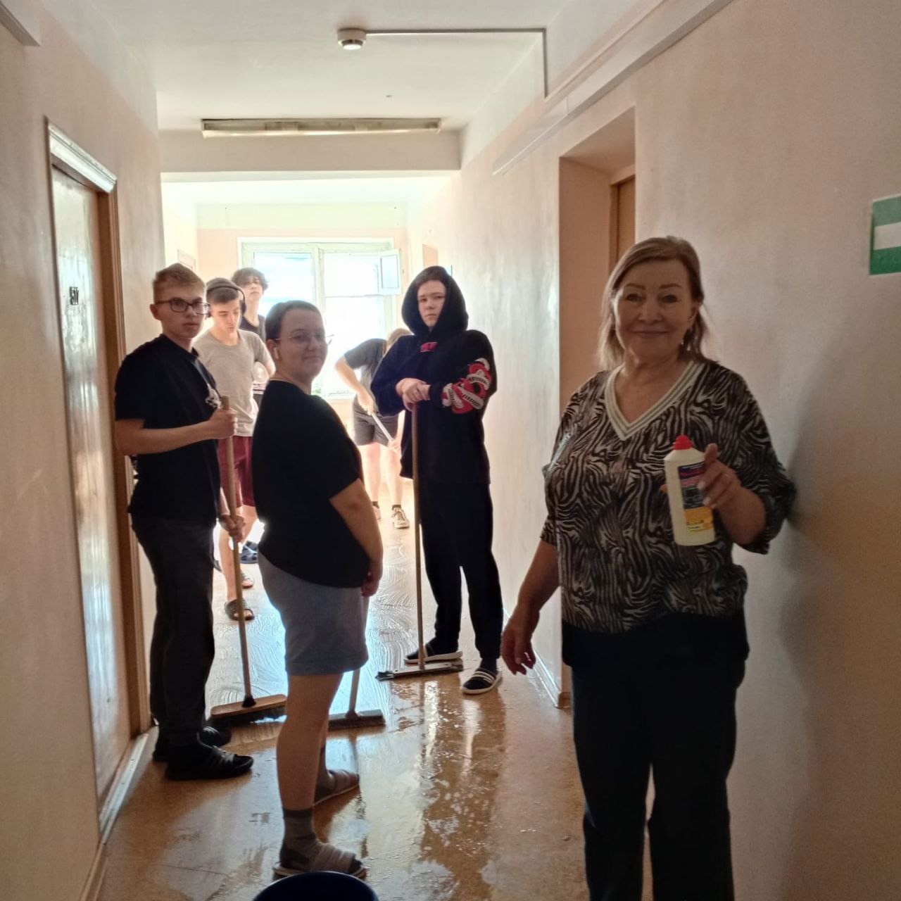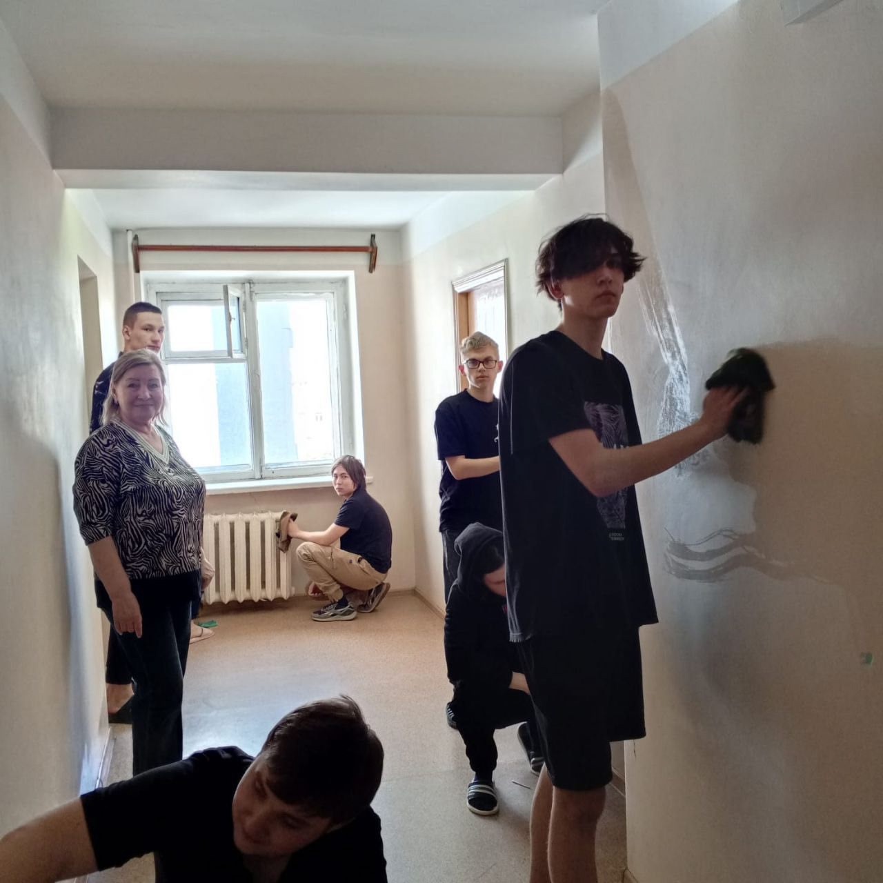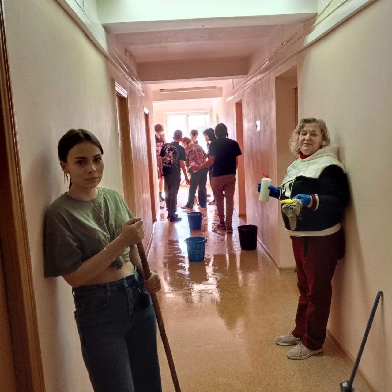 3 апреля студенты колледжа связи ПГУТИ в рамках месячника по благоустройству территории провели генеральную уборку коридора 5 го этажа общежития: отмыли стены, двери, пол.