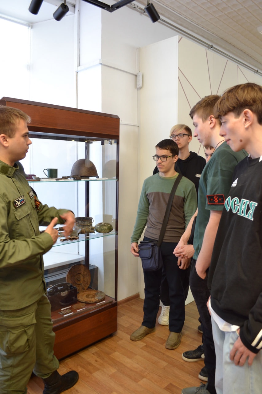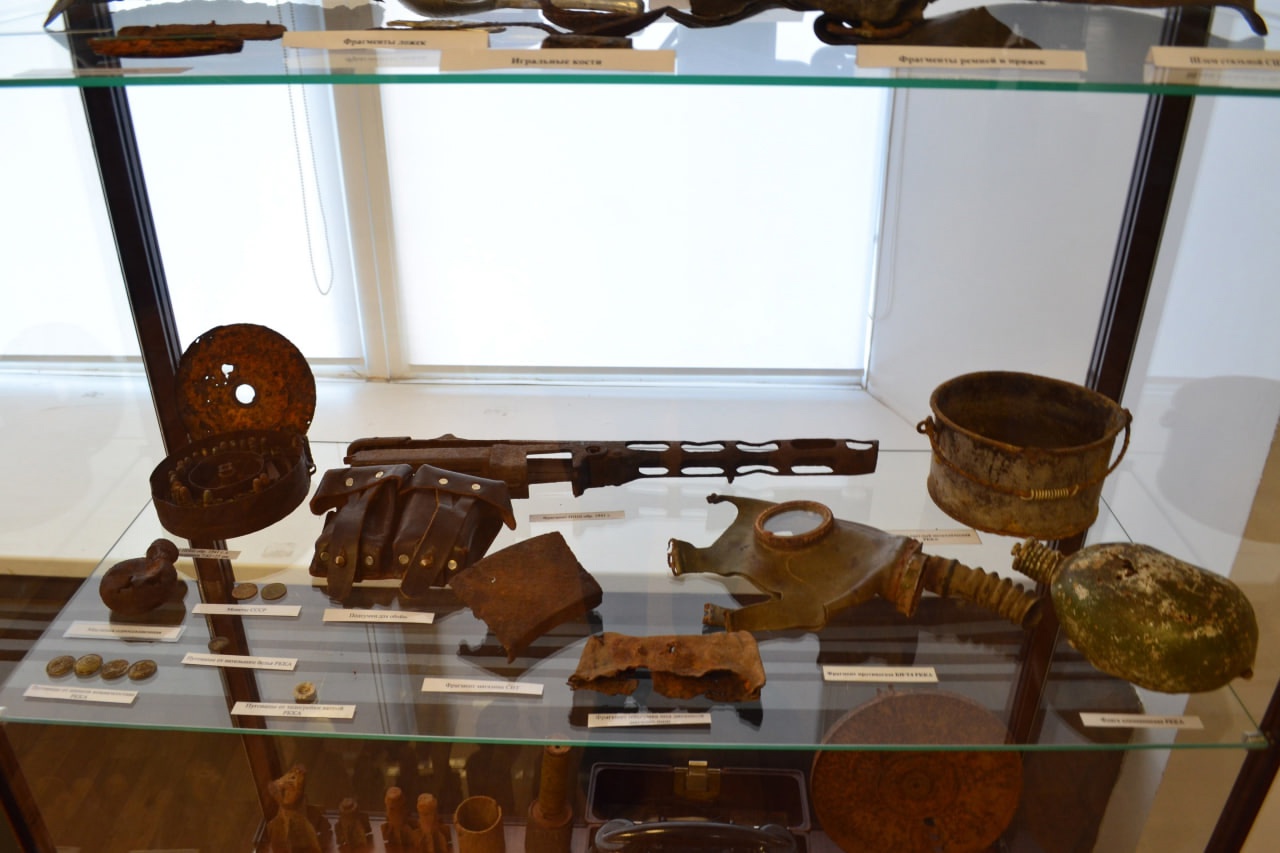 - подлинные предметы военного быта и снаряжения советских воинов, обнаруженные поисковиками на местах боев: оружие, шлемы, патроны, личные вещи бойцов.
