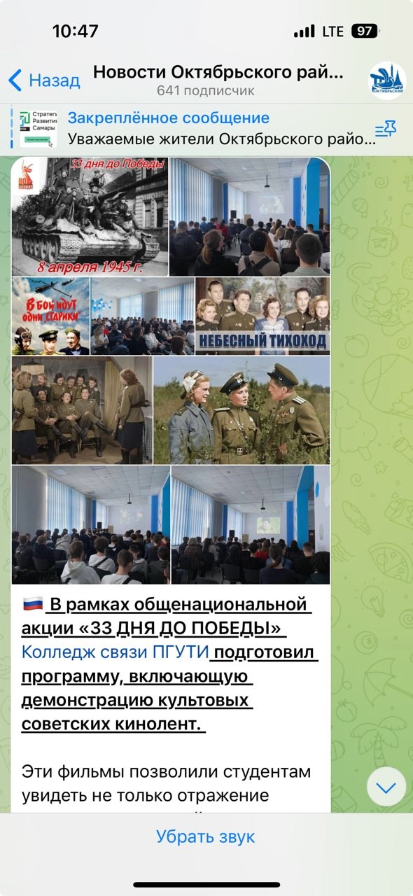 Инициатива отдела ВР колледжа связи ПГУТИ, который подготовил кинопоказ в рамках общенациональной акции «33 ДНЯ ДО ПОБЕДЫ» была по достоинству оценена администрацией Октябрьского ВГР. На ленте Октябрьского ВГР опубликовали наш пост.