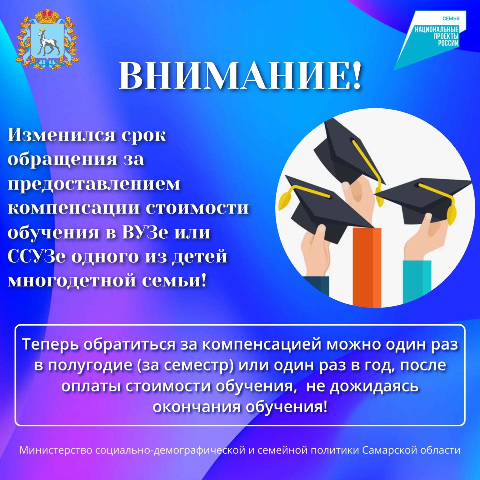 Министерство социально-демографической и семейной политики Самарской области напоминает: вы можете оформить компенсацию в размере 50% от стоимости обучения в вузе или ссузе для одного из детей в многодетной семье