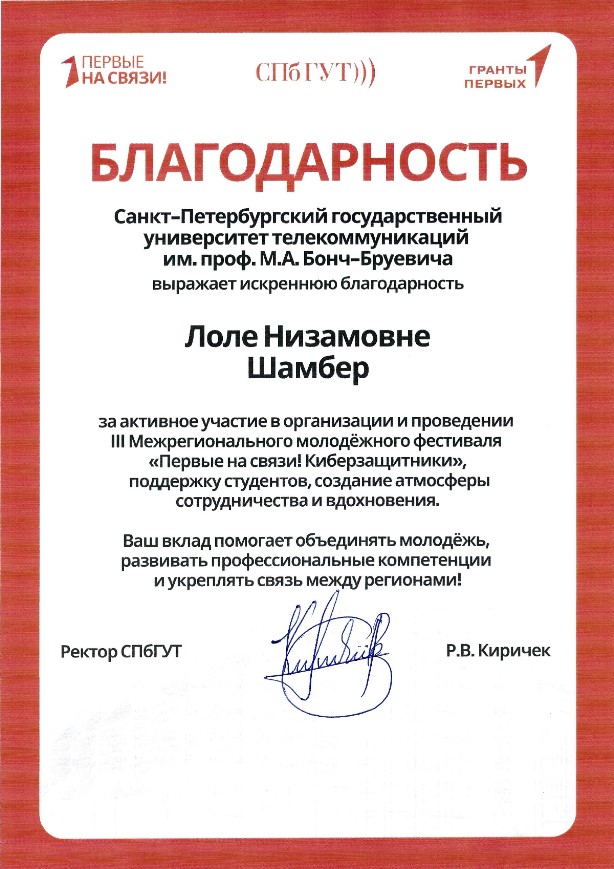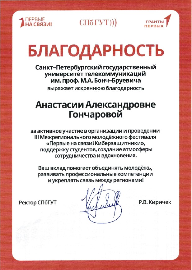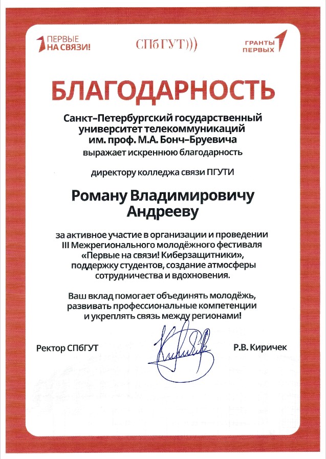 С 12 по 15 ноября в Санкт-Петербурге прошел III Межрегиональный молодежный фестиваль «Первые на связи! Киберзащитники». Участниками фестиваля стали студенты Санкт-Петербургского колледжа телекоммуникаций (входит в состав СПбГУТ), Архангельского и Смоленского колледжей телекоммуникаций (филиалы СПбГУТ), колледжа связи ПГУТИ (Самара), колледжа телекоммуникаций МТУСИ (Москва) и колледжа телекоммуникаций и информатики СибГУТИ (Новосибирск).