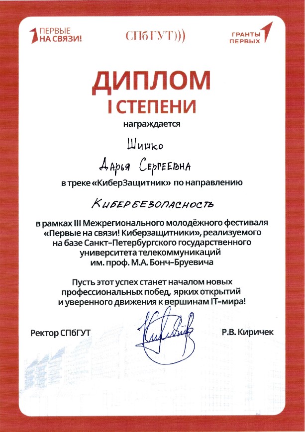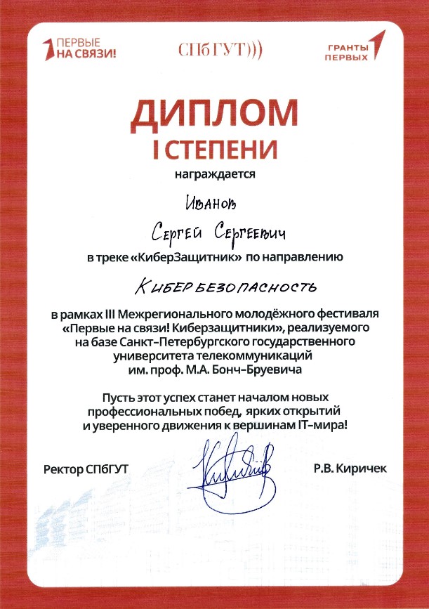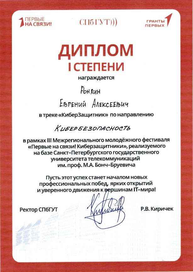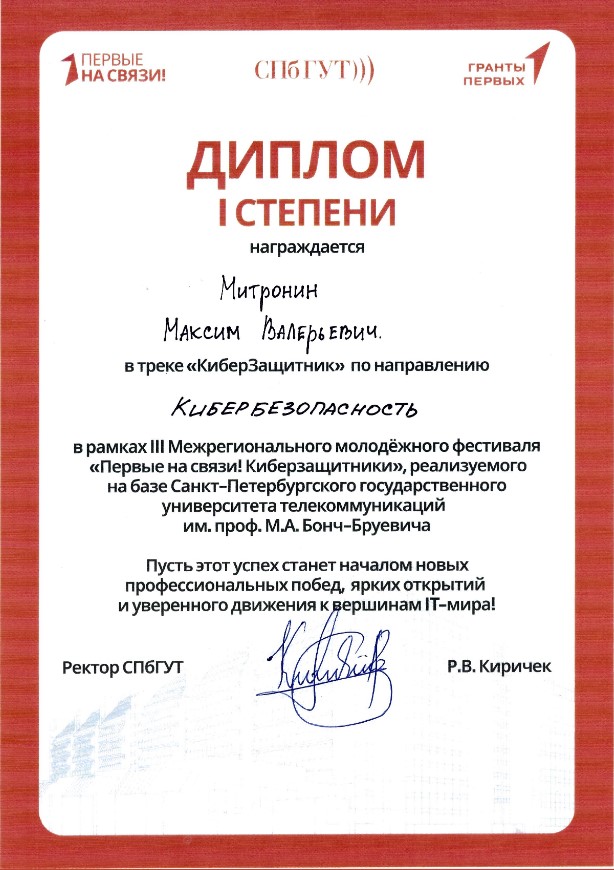 Команда в составе Иванова Сергея, Митронина Максима, Ронжина Евгения и Шишко Дарьи одержала Победу в номинации «Кибербезопасность» трека «КиберЗащитник».