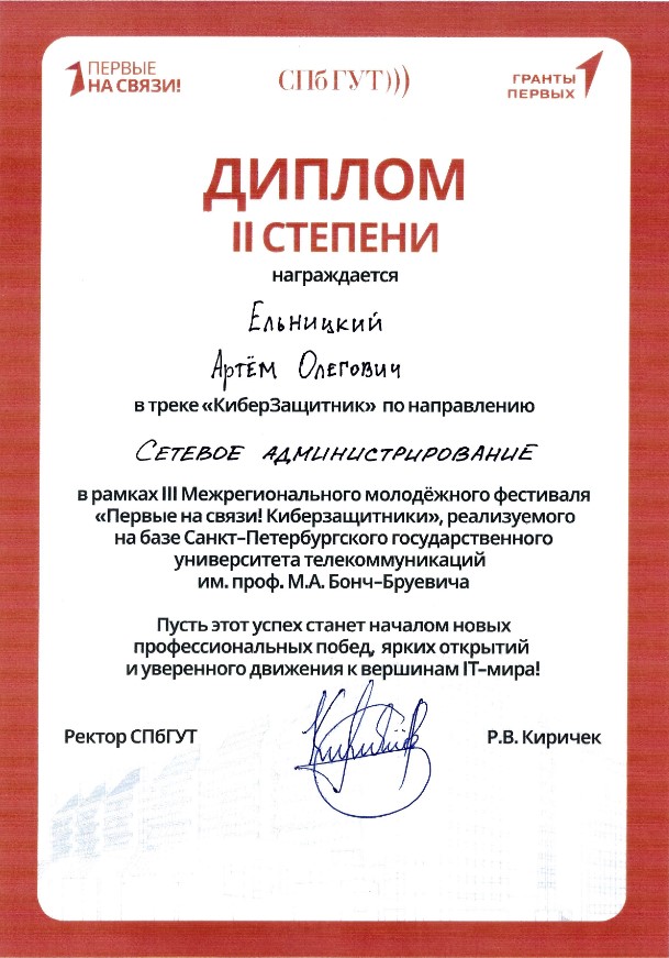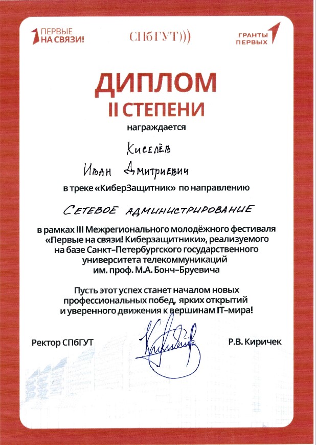 Второе место в соревнованиях по направлению «Сетевое администрирование» занял коллектив, состоящий из Ельницкого Александра, Киселёва Ивана и Мирошникова Степана.