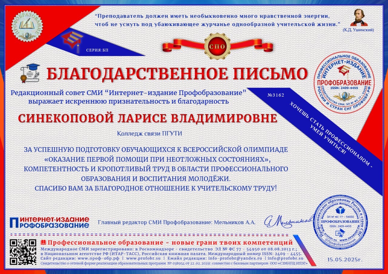 Подробнее: Всероссийская олимпиада «Оказание первой помощи при неотложных состояниях».